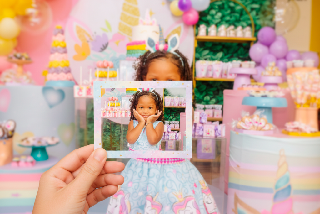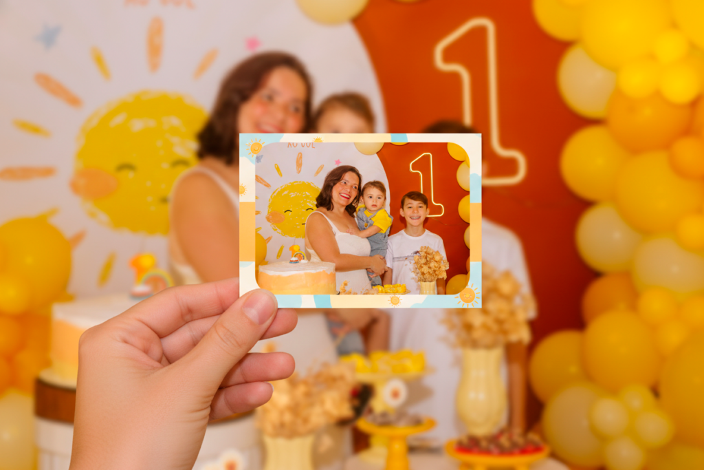 Além da diversão, as fotos impressas funcionam como lembrancinhas, substituindo ou complementando os tradicionais brindes de festa. Uma recordação afetiva que permanece muito além do dia da comemoração.